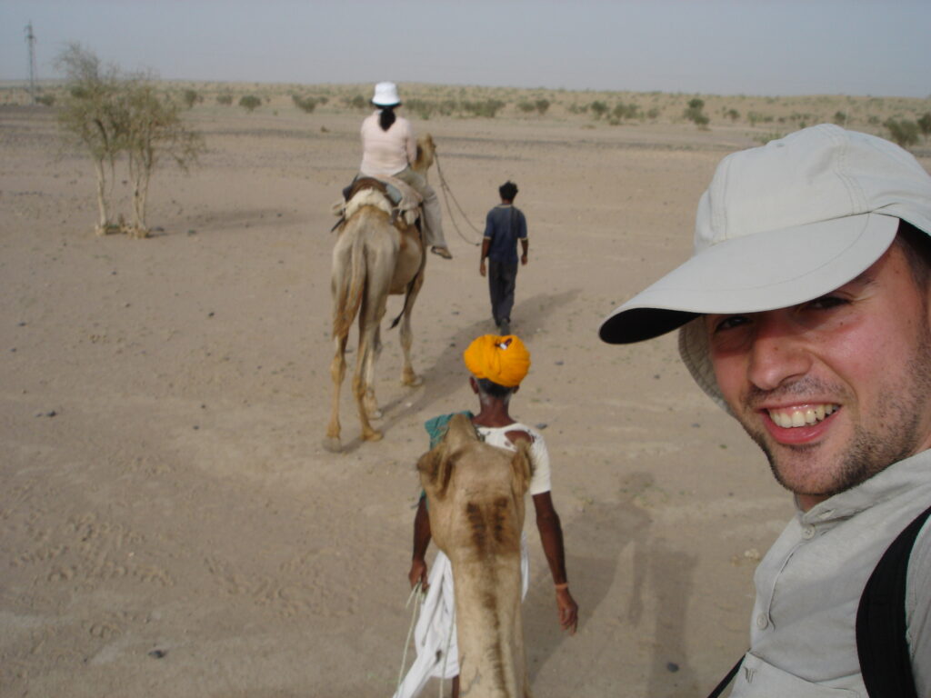 Luego habíamos contratado en el hotel un safari por el desierto y a las 2:30 vino a buscarnos en un Jeep un tío al que no conocíamos de nada y nos iba a llevar al desierto. Primero paró en un mercado y se subieron en nuestro Jeep una mujer con sari, un chico y una niña muy pequeña que fue la única que montó adelante y tardó 30 segundos en dormirse. No es que se durmiese normal, es que se durmió a lo largo con la cabeza estorbando al que conducía y evidentemente sin cinturón ni silla ni nada parecido. Paramos en un cementerio de Maharajaes y después en un poblado en mitad del desierto, de donde era el del Jeep, la señora y la niña. Si la India es pobreza extrema, ya en el desierto os podéis imaginar el panorama: 5 años sin llover, el pozo mas cercano a 5 kilómetros… Luego fuimos a otro poblado a por los camellos. A Salva le agarró un niño de 8 años de la mano (Vikram) y le empezó a llevar con paso rápido por todo el poblado. Era un poco sospechoso ya que los niños no se atreven a darte la mano pero le seguimos y nos quería meter en su casa para supuestamente enseñarla. Al entrar en una especie de patio salieron 3 mujeres que se abalanzaron sobre Carol y la intentaron quitar o robar el reloj, el gorro y el coletero todo a la vez, mientras el niño tiraba de Salva que iba toda pastilla y no se enteraba de nada. Pasado ese mal rato montamos con dos desconocidos camelleros y sus camellos rumbo al desierto. Los cuatro, mejor seis con los camellos, dimos un paseo de una hora por el desierto tan felices hasta llegar a una duna donde nos esperaba el del Jeep. Durante el paseo te descuenta de que estás en el desierto con dos tíos que no conoces de nada y que en España te darían miedo, sin nada alrededor, perola gente aquí es muy honrada así que sin problema.