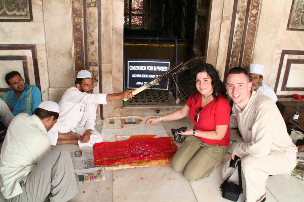 A las 7:30 ya estábamos en carreta (por decir algo). Primero visitamos Fathepur Sikri, una ciudad abandonada al poco tiempo de fundarla los mongoles hace 300 años, por falta de agua. Aquí los guías locales literalmente se han pegado por nosotros (hay poco turismo) El guía que nos ha acompañado pronunciaba el inglés como mi padre, Carol pasaba de él y él de ella. Fijaos hasta donde llégale ingenio (o el hambre) que mientras el guía nos explicaba, un tío se iba quitando la ropa para tirarse a un tanque de agua verdosa y asquerosa mientras nos llamaba para que le hiciéramos una foto a cambio de pasta Evidentemente no colaboramos en dicha azaña. En el segundo palacio tuvimos otro guía que nos llevó dentro del patio del propio palacio a ver un puesto que estaba en el suelo y que era de su familia (aquí los 1300 millones de indios son familia…) Mientras un tío abanicaba a Carol (tal cual) otro nos vendía un elefante dentro de un elefante dentro de un elefante (si, si) Después de hacer una ofrenda en una tumba donde atabas una cuerda y pedías un deseo de regatear y comprar algo, vimos la segunda puerta mas alta del mundo y a su lado una cabra comiendo papel (que impactó mas que la puerta a Carol).