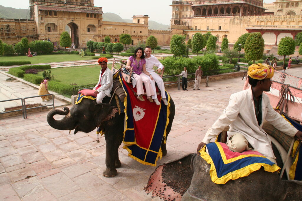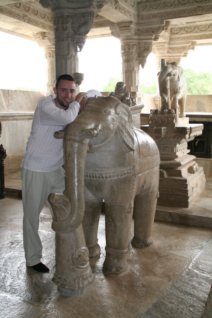 Durante la mañana nos ha acompañado un guía que hablaba castellano y estaba sacado de Miami Vice. Camisa blanca, zapatos italianos, gafas de sol… era un guays de la pradera, con eso queda todo dicho. Además tenía mucha familia, amigos y demás por lo que nos ha llevado a una tienda de piedras preciosas donde tenían cosas horrorosas y no hemos comprado nada, además siempre te quiere vender que si un libro que si en esta tienda… era tan pesado que a las 2 de la tarde le hemos dado 700 rupias y el pasaporte hacía otros guiris a los que chupar la sangre. Por la mañana hemos visto el fuerte amber que es una antigua ciudad donde vivía un Maharajá con sus esposas. Para llegar te llevan en coche y luego te suben en elefante por la nada despreciable cantidad de 10 Euros por 10 minutos (quien dijo que India era barata?) mas propi al chofer. Mientras vas en elefante los lugareños desde abajo te quieren vender hasta a su madre, todo en perfecto castellano sin nosotros abrir la boca, debe ser que rebosamos patriotismo!!! Después del fuerte hemos el observatorio que se montó un maharajá hace 300 o mas años y donde hay un reloj de sol que te da la hora exacta. Luego el palacio donde vive el actual Maharajá y el palacio de los vientos, solo por fuera, ya que por dentro no vale nada (o no cobran nada por entrar y por eso no les interesa que entres). Hemos largado al guía, hemos venido al hotel y por la tarde hemos ido al templo hinduista de Birla que quizá es lo que mas nos ha gustado en todo Jaipur. Luego un par de templos mas pequeños donde entras en pieses, tocas a una diosa en la pared tipo elefante, tocas una campana las veces que te da la gana, pasas dentro, te dan unos caramelos de anís pequeños, tiras una moneda y te piras. Vamos como ir a misa pero en 40 segundos.